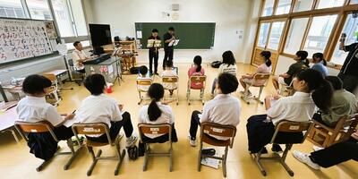 また、中学2年生の咲和さんと小学1年生の健斗さんがトランペットに挑戦。初心者にとって音を出すのは難しいとされていますが、2人が見事に音を鳴らした瞬間、教室は大きな盛り上がりを見せました。授業の最後には、本校音楽科教諭の中原弘道先生もキーボードで加わり、3名で「旅立ちの日に」を演奏。美しい音色が教室いっぱいに響き渡りました。