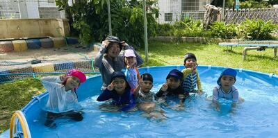 令和7年6月24日(火)、幼稚園の園庭にて今年最初のプール遊びを実施しました。7名の園児が楽しみにしていたプール遊びでみんな大はしゃぎでした。校門から入って右手の花壇にはかわいいミニひまわりが咲いています。来園の際にはぜひご覧ください。